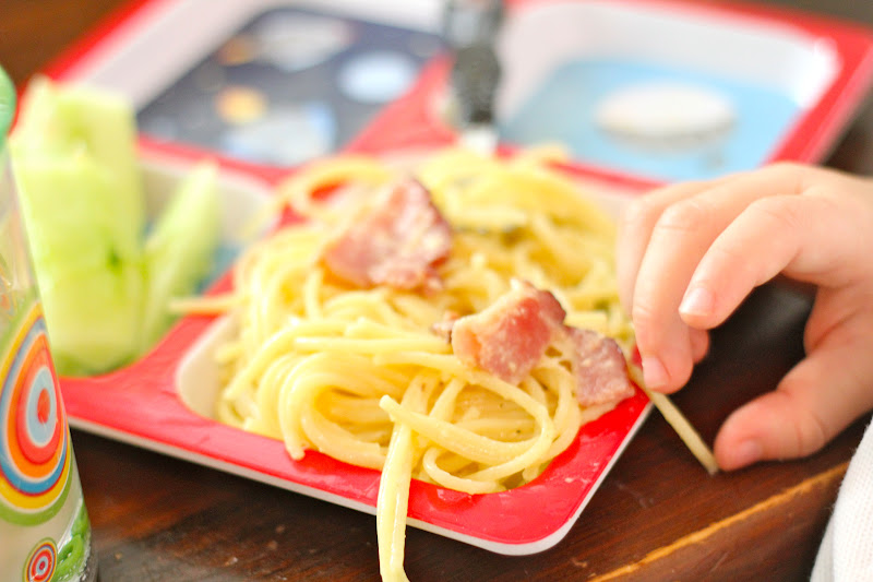Spaghetti Carbonara with impatient fingers ready to pounce: