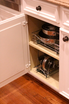 I decided to take Martha's advice on Drawer Organization and install drawers and a lid organizer in my cabinets. This allows you to easily access those deep lower cabinets...without having to physically crawl inside. My favorite store, the Container Store, sells these chrome roll-out drawers and lid holders. This is my newly organized cabinet with drawers:
