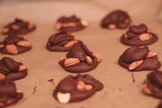 To make the nut clusters, just drop a few teaspoons of this yummy chocolate on a non-stick surface. Drop a few almonds on the chocolate base and finish by drizzling with more chocolate on top. Put in the refrigerator to harden.